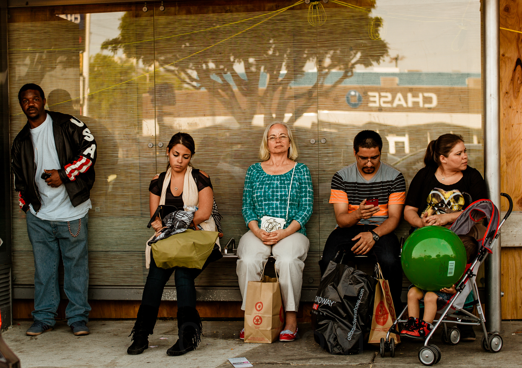 I see 5 people who couldn’t be more DEtached if you paid them to be…and an alien-swiss-ball-being (green, of course!) with two legs sprouting from beneath it as it sits in a stroller…all of this weird assortment could be awaiting the return of the alien mothership to suck them back up into the heavens above and up, away from this forsaken, yet incredibly uninteresting orb of un-delight….how was that for a fantastic imagination? I can lay the blame squarely on the quad venti, white mocha latte I just downed…yum!